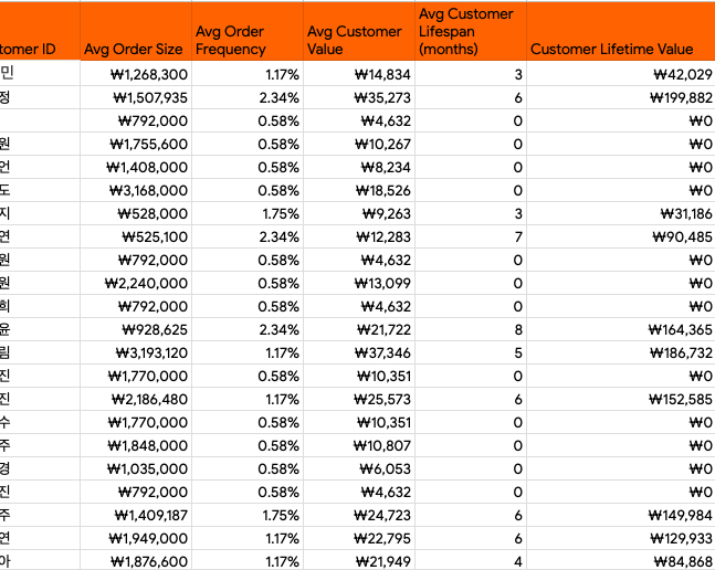 시트1 Customer ID,Amount,Customer ID,Avg Order Size,Avg Order Frequency,Avg Customer Value,Avg Customer Lifespan (months),Customer Lifetime Value ********,2023-12-01,₩1,408,000,0001,₩1,268,300,1.17%,₩14,834,3,₩42,029 ********,2023-12-01,₩767,25